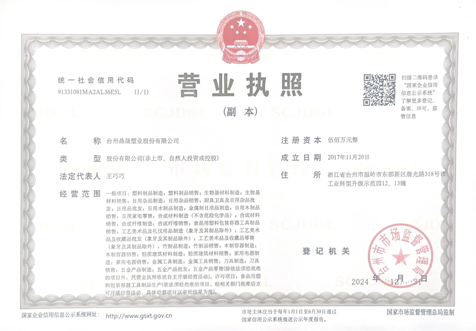 Registered address : Building 12 And 13, Industrial Transformation And Upgrading Demonstration Park, No. 318 Chengguang Road, Eastern New Area Taizhou Zhejiang China